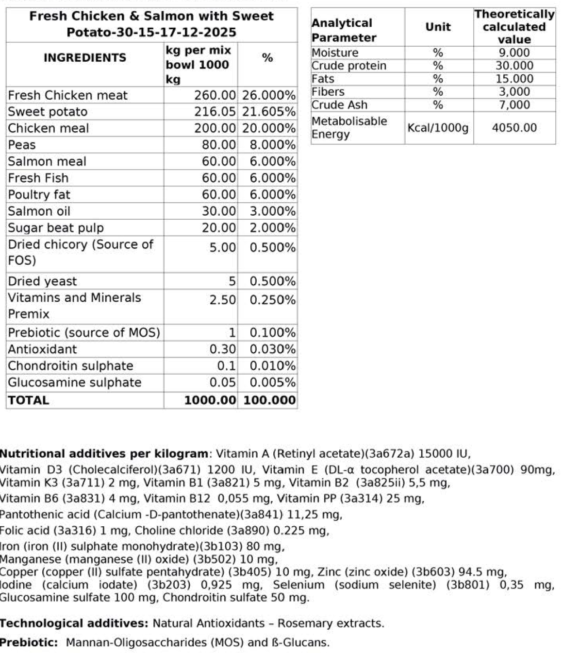 Nos croquettes au Poulet/Saumon sont conçues pour offrir à votre chien une alimentation saine et savoureuse, une recette riche en protéines animales, idéale pour un poil brillant, une peau saine et une digestion maîtrisée. Le saumon apporte des omégas 3 naturels, essentiels au bien-être quotidien du chien.